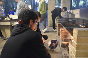 4月6日には野外炊事場にて班ごとにカレーライスを作りました。 薪をくべて火を起こしたり、飯ごうでご飯を炊くなど慣れない作業にも関わらず、班員同士で協力し合いカレーライスづくりに励んでいました。 中にはガラムマサラやクミン、レッドペッパーなどの調味料を入れ、本格的なカレーライスを作っている班もありました。自分たちで作ったカレーライスは美味しさも格別で、班員から「おいしい!」との声も上がり、食事をしながら会話に花を咲かせていました。